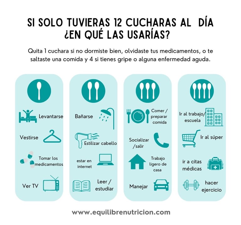 Imagina que cada unidad de energía que tienes es una cuchara. La mayoría de las personas sanas despiertan con un cajón lleno de cucharas: cientos de ellas. No tienen que pensar en cuántas gastan para ducharse, preparar café o ir a trabajar. Simplemente lo hacen.